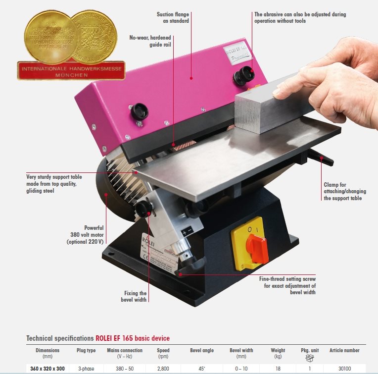 to aluminium. A hand wheel provides infinite, precise bevel width