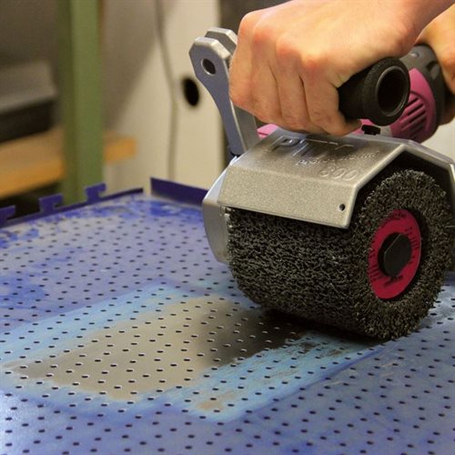 cleans without removing material. Ideal for car bodywork, the automotive industry, shipyards, and renovation work by commercial decorators and builders. At a width of 100 mm, the overhang provides a working width of 110 mm (fits all satin-finish tools). The tightening screw is sunk into the wheel, allowing grinding up to the edge.