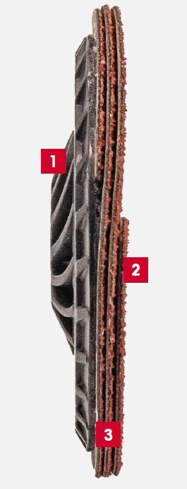 This ingenious new development is an ingenious combination of flap disc and ceramic fiber disc , which combines durability and grinding performance of both systems. Increases in stock removal of 30 to 40%, e.g. B. compared to ceramic flap discs are achieved on average. The flat arrangement of the lamellas and the wide contact surface enable a high grinding speed on all metals, that were previously only known from cubic ceramic fiber discs . Similar to a flap disc, the lamellas are completely used up at the edge of the lamellas and provide fresh grain. These repolishing properties of the carrier fabric result in significantly lower roughness on the surface of the workpiece achieved.
