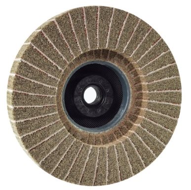 The coordinated combination of ceramic abrasive flaps alternating with foamed fleece produces a much better grinding performance, longer service life, and fine grinding results. For preparatory grinding and fine grinding of spot welds and deep scratches on stainless steel, steel and non-ferrous metals; also great for finely deburring perforated sheet metal and reworking corners.