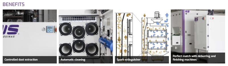 Due to the six high efficiency cartridges, combined with an efficient design, this system is perfect to keep the finishing and deburring machine clean and also to prevent the release of any dust in the work place.