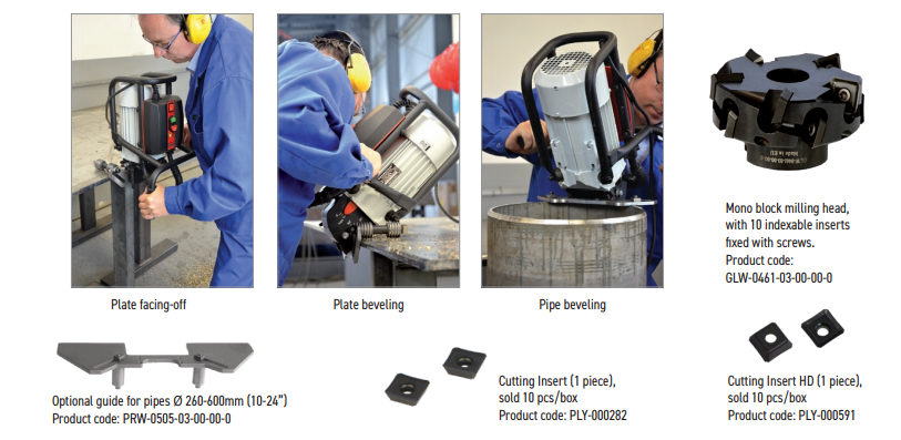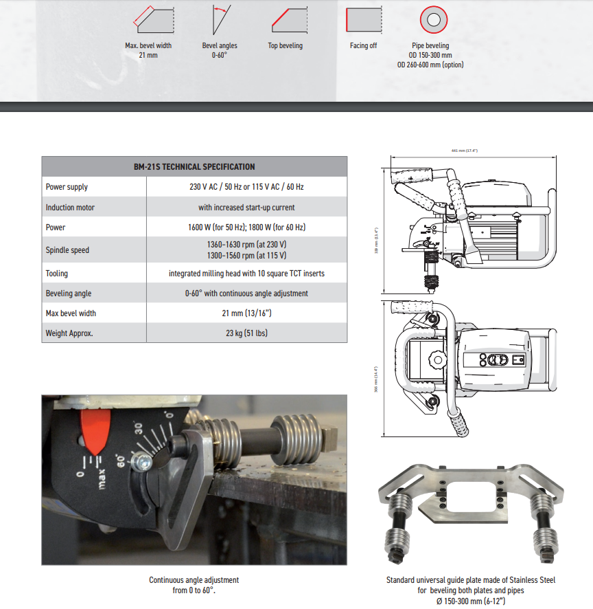 The BM-21S Beveling Machine is designed for milling edges of plates and pipes made of stainless steels. The machine enables to bevel sheet edges as well as pipe edges with diameters from 150 mm (6”) to 300 mm (12”) in 0–60° range with maximum bevel width of 21 mm (13/16”). When equipped with an optional guide, BM-21S allows working on pipes with diameters over 300 mm (12”).