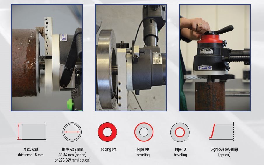PRO-10 PB is able to bevel, face off, ID chamfer, counterbore and J-beveling, making all these weld prep operations quick and simple.