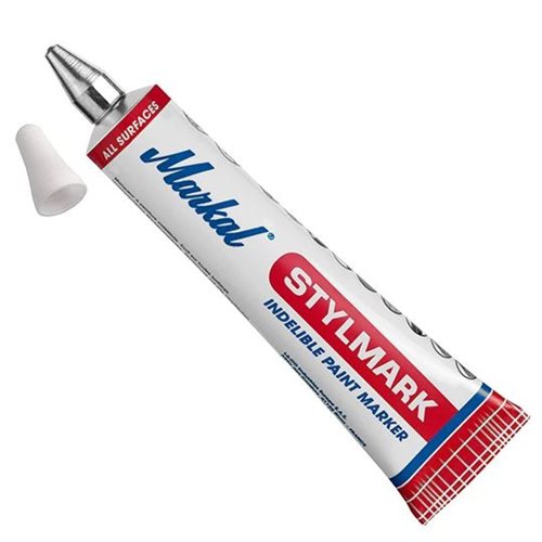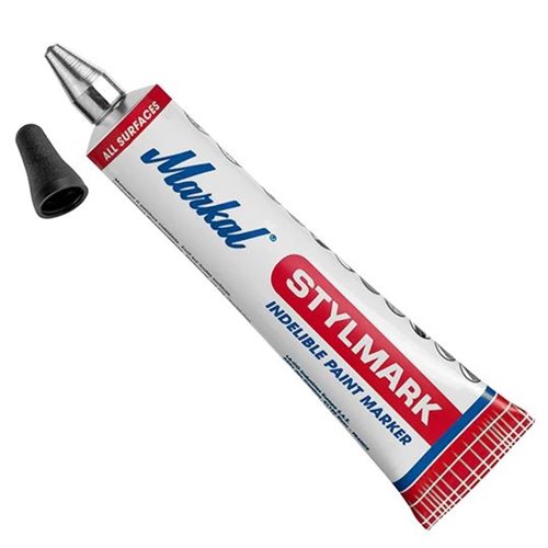 Markal Stylmark is a metal-ball tip marker for marking most surfaces. The aluminum squeeze tube and thick paint makes it suitable for rough, vertical and overhead surfaces with excellent adhesion on oily and wet surfaces. Xylene-free paint reduces user health risks. - Stylmark is the replacement for Ecrimetal